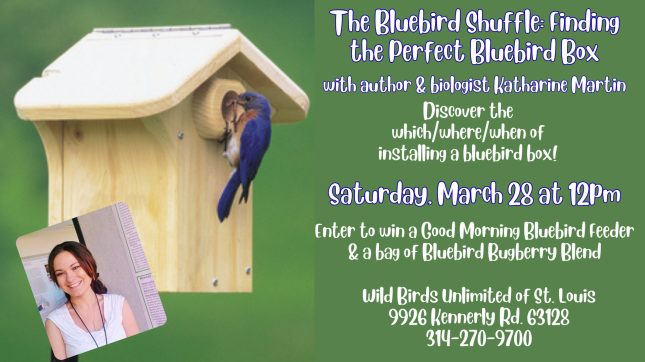 Did you know it was through the efforts of bluebird societies to install & monitor bluebird boxes that the population of Eastern Bluebirds was saved? Discover how you can do your part and learn all about installing a bluebird box in your backyard. Biologist, author, and member of the MO Bluebird Society Katharine Martin will lead this lively discussion and answer your questions. You don't have to be ready to install a box to learn about bluebird mating & nesting habits, please join us!